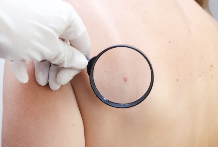 Visual examination: GP checks moles using the ABCDE rule.ย