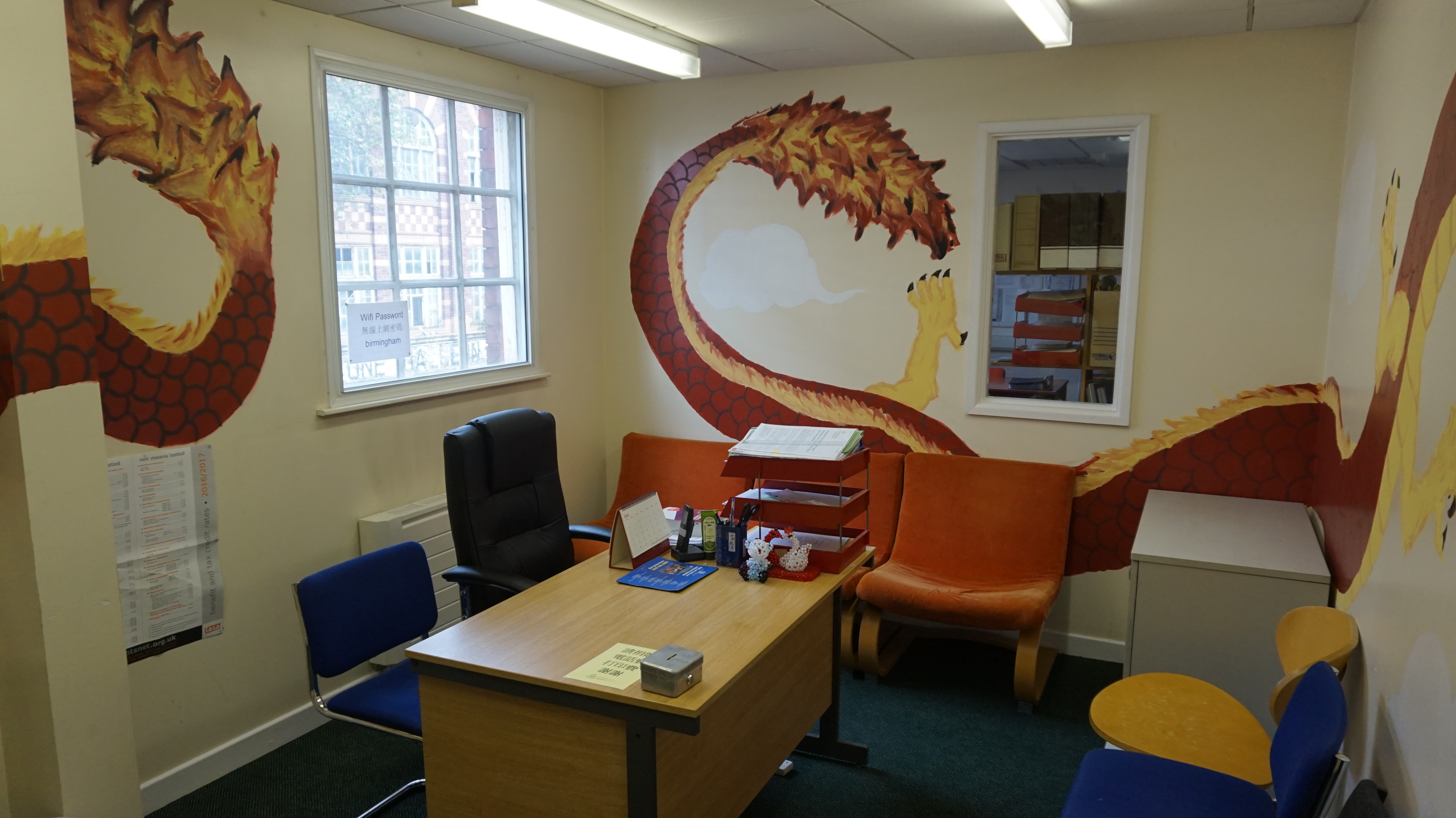 The Dragon Room is a small room furnished with comfy chairs as well as desk and chairs. It is suitable for interviews, 1:1 counselling and small team meetings in a more relaxed setting. It could also be used as a breakout room with the training room.